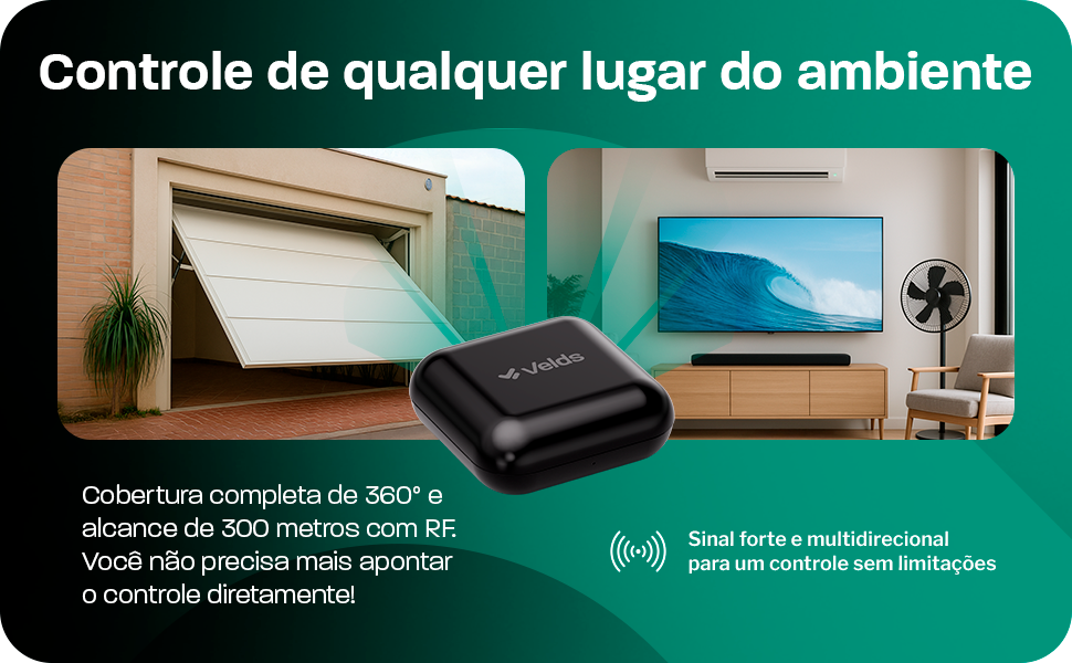 Comande TVs, ar-condicionados, portões de garagem e muito mais. O Velds controla dispositivos infravermelho (IR) e radiofrequência (RF 314/433MHz), ampliando sua automação residencial.