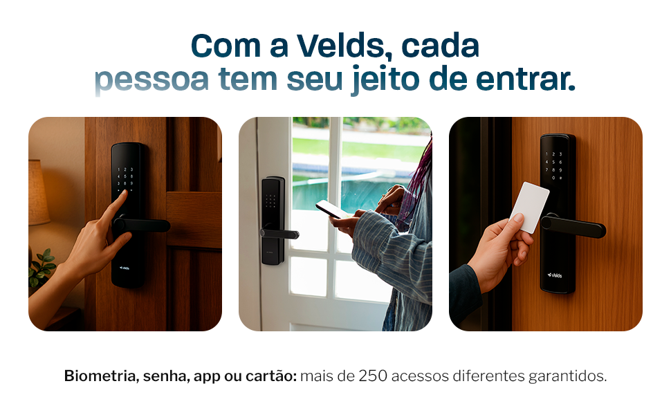 Desbloqueie a porta com impressão digital, senha, aplicativo Velds, Cartão RFID ou Chave Mecânica.